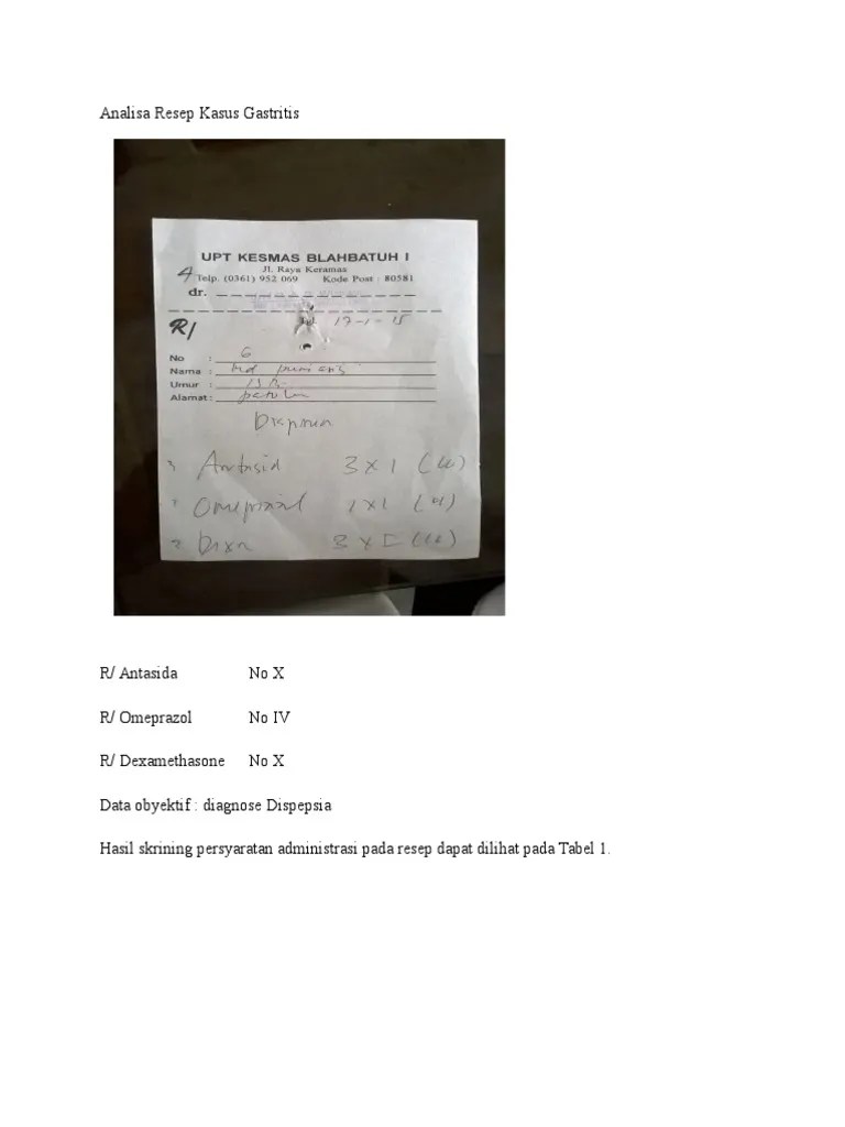 0194g007 tenaga medis 1 dokter umum 1 dokter gigi 1 perawat umum lokasi pelayanan jl. dokter gigi diberi izin menulis resep dari sesgala macam obat untuk pemakaian gigi dan mulut dengan cara injeksi parental. Yang berhak menulis resep ialah: Konsumen tanpa resep dari dokter gigi. Apabila diberikan aturan pakai 3x sehari, maka harus dikonsumsi setiap 8 jam sekali, jika diberikan aturan pakai 2x sehari, maka harus dikonsumsi setiap 12 jam sekali.